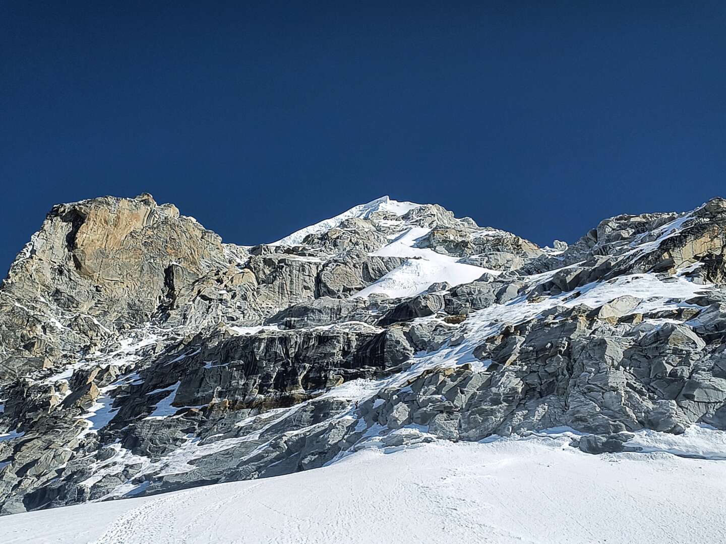 Za dnia z przełęczy dobrze widać całą drogę na szczyt. W linii prostej to jakieś 500 m w poziomie i 450 m w pionie. Prawie całość zaporęczowana, ale za dnia przy takich ilościach śniegu, jakie my mieliśmy, można by to spokojnie zrobić z buta bez liny.